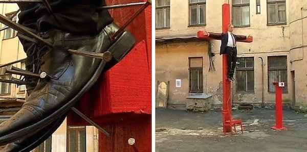 به گزارش بخش تجسمی آکادمی هنر و به نقل از شبکهی N_TV یک هنرمند لتونایی اخیراً در محل ساختمان سابق ک.گ.ب در شهر ریگای این کشور تمثالی عروسکی از ولادیمیر پوتین؛ رئیسجمهور کشور روسیه را به صلیب کشید. این هنرمند همچنین از بازدیدکنندگان خواست که او را در زدن میخ به پاهای تمثال پوتین یاری کنند.
