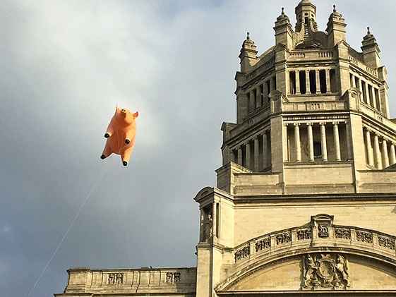 ایده یک خوک معلق بر فراز نیروگاه بترسی انگلیس متعلق به راجر واترز (نوازنده گیتار بیس) بود. گروه به همین منظور ساخت یک بالون به شکل خوک و به طول ۹ متر را سفارش داد. قرار شد تا این بالون که با گاز هلیوم پر شده بود پر فراز نیروگاه به پرواز درآورده شود و از آن تصویربرداری کنند. گروه میخواست تا برای طرح روی جلد آلبوم «حیوانات» تصویری واقعی و نه مونتاژ شده استفاده کند.