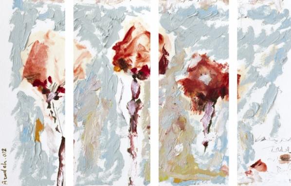 «آبدیدهگان روایت من است از مناسبات انسانی، تکه هایی از آنچه میان من و آدمیان شکل گرفته و نقطهی تلاقی بین میل و رخوت. برای شکل دادن به این مجموعه من از پرترهی نزدیکانم و دریای خزر عکاسی کردم و بعد وقت کشیدن پرترهها و خطوطی که در برشان گرفته به عکسها نگاه کردم. من از رنگ روغن بر روی پارچهی بوم استفاده کردم تا بافت جسمی و ضخیم و کیفیت رنگی دلخواهم را، به ویژه در سفیدیها، به دست بیاورم. در اغلب کارها، پرتره هایی به مرور زمان پوشانده شده و پرترههای دیگری سر برآوردهاند و تصویر به تدریج تخریب و ساخته شده است. این نقاشیها لایههای اندوه من را در خود دارند. گویی که در گودالی باشم و بازی کنم، بی توجه به خطرات احتمالی مرگ و دفن شدن، من یک مشاهدهگر تلخ گوشتم که کاری نمیتوانم کرد جز سوگواری برای تکه های از دست رفته وهمآغوش شدن با آن و خودم را از درون و بیرون بهش رساندن در یادبود برای شهری که ناپدید میشود من از ویرانه گردی هایم وام گرفتم. تکه های سفال ها را پیدا کردم و کنار هم گذاشتم و خانههای در شرف ویرانی یا ویران شهر را کشیدم، به گزیده. من فقط یک زندگی ام، در برابر سیل عظیمِ زندگی هایی که در شهر می پیچند و بازش میشناسند و این فقط یک جور مرثیه سرائیست، برای تجربه ای جمعی، که جان میسپارد در آغوشمان و جای میسپارد به دردی جمعی».